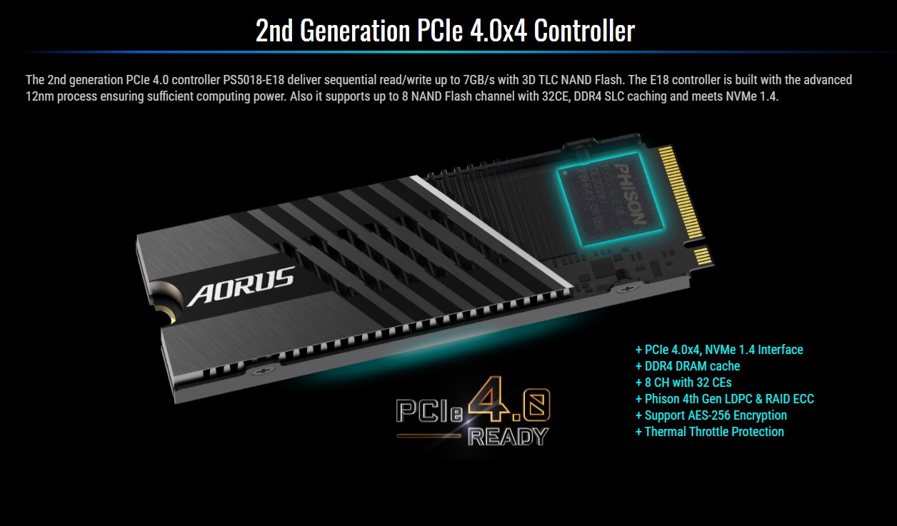 Để đạt được tốc độ đọc 7000Mb/s, Ổ cứng SSD Gigabyte AORUS 1TB PCIe Gen 4.0×4 sử dụng các chip nhớ 3D TLC Nand được tuyển chọn kỹ càng, đi cùng bộ điều khiển Phison PS5018-E8 mới nhất.