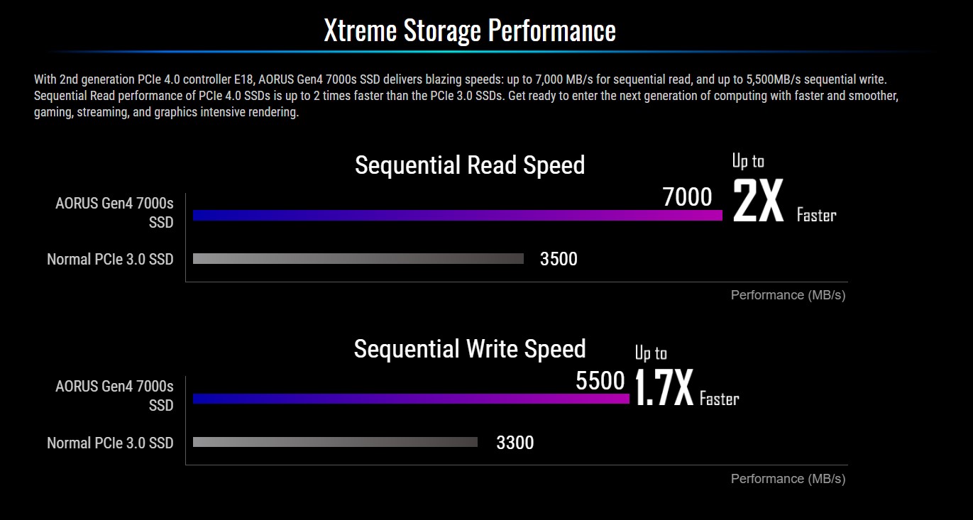Ổ cứng SSD Gigabyte AORUS 1TB PCIe Gen 4.0×4 là một trong những SSD M.2 NVME nhanh nhất trên thị trường. Với giao tiếp PCIe Gen 4 x4, tốc độ tối đa có thể đạt được lên đến 7000 Mb/s, gấp 100 lần HDD truyền thống.