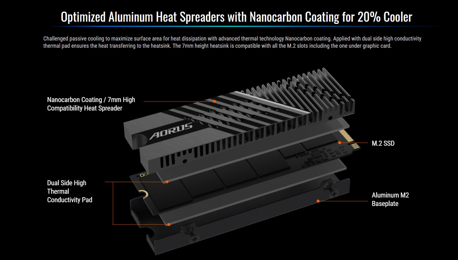 Nhận thấy tản nhiệt cho các SSD M.2 hiệu năng cao là vấn đề vô cùng quan trọng, Ổ cứng SSD Gigabyte AORUS 1TB PCIe Gen 4.0×4 tích hợp sẵn tản nhiệt nhôm kích thước lớn, đảm bảo nhiệt độ luôn ở mức ổn định, giúp SSD chạy ở hiệu năng đỉnh lâu hơn 46% thông thường!